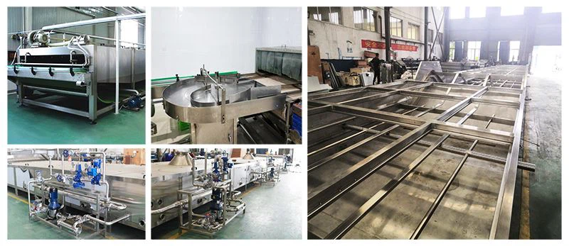 De tunnelpasteurisatiemachine werkt in verschillende behandelingsfasen--- met circulerend warm water om het product voor te verwarmen, heet water om te steriliseren, warm water om voor te koelen en koel water om het product af te koelen.